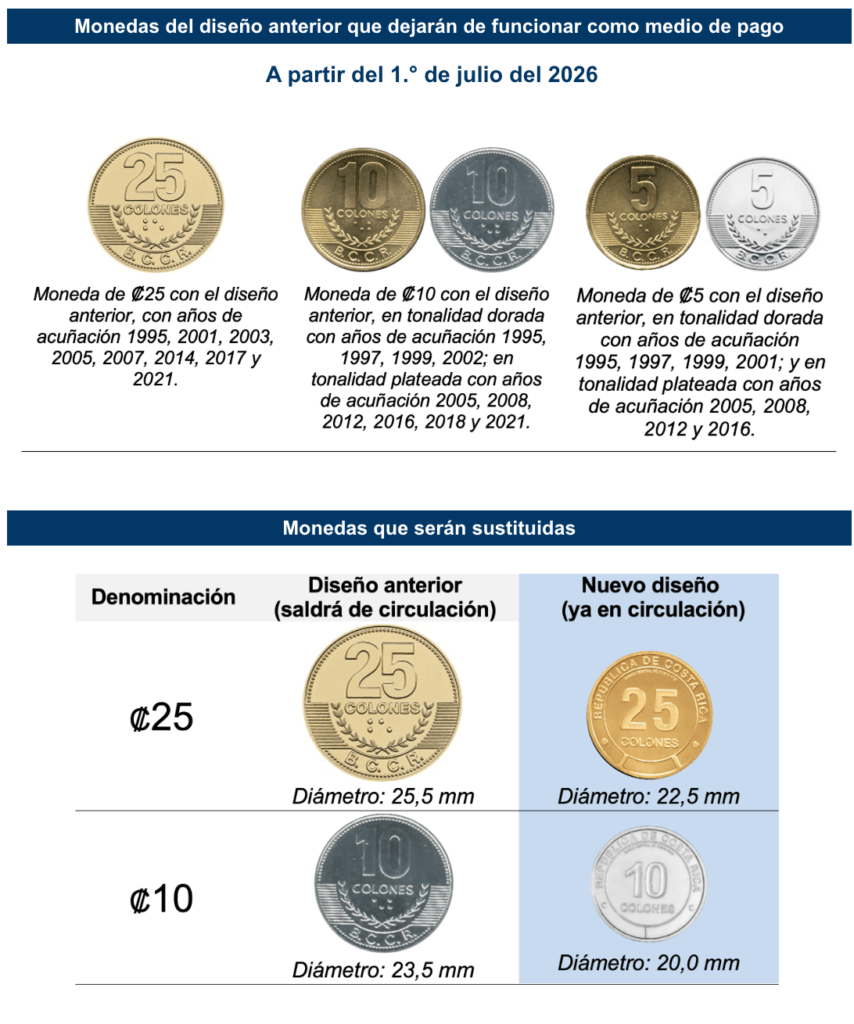 SAN JOSÉ, Costa Rica. El Banco Central de Costa Rica (BCCR) informa a la ciudadanía que a partir del 1.° de julio del 2026, las monedas de ₡5, ₡10 y ₡25 del diseño anterior perderán su valor como medio de pago, por lo que dejarán de ser válidas en transacciones comerciales.