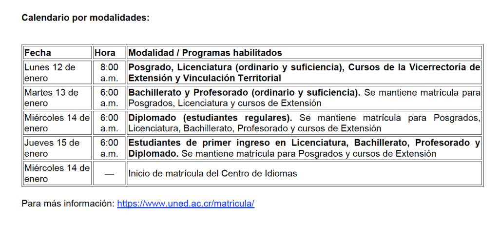 SAN JOSE, Costa Rica. La Universidad Estatal a Distancia (UNED) abrirá el periodo de matrícula para el primer cuatrimestre y semestre 2026 en modalidad web entre el lunes 12 de enero a las 8:00 a.m. y el sábado 17 de enero a las 5:00 p.m..