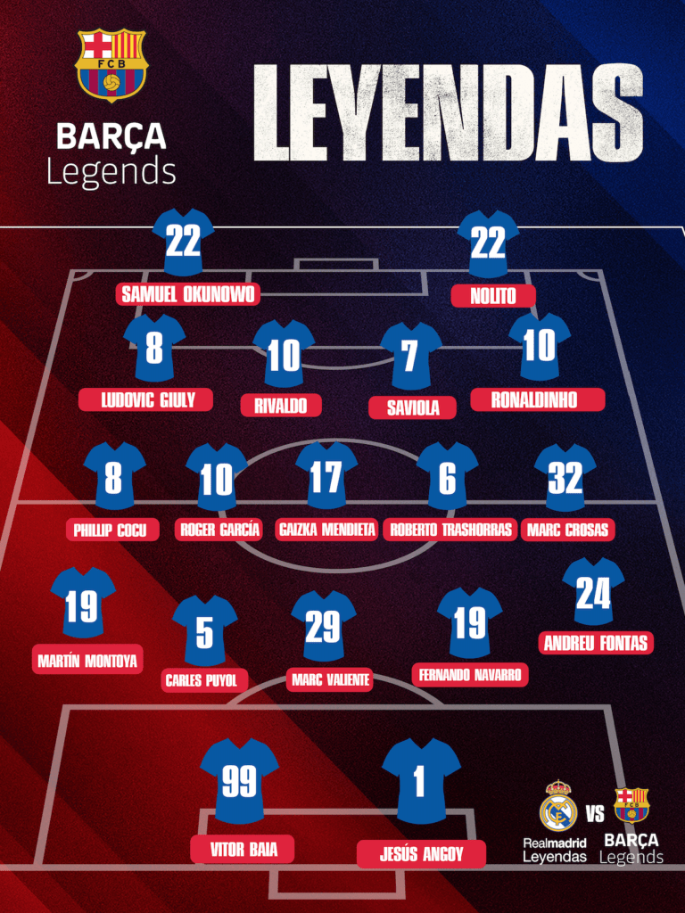 Nómina del Barça Legends: Ronaldinho, Rivaldo, Carles Puyol, Saviola, Gaizka Mendieta, Marc Crosas, Roberto Trashorras, Manuel Agudo “Nolito”, Fernando Navarro, Vítor Baía, Jesús Angoy, Ludovic Giuly, Andreu Fontas, Marc Valiente, Martín Montoya, Roger García, Phillip Cocu y Samnuel Okunowo. El DT del equipo es Albert Ferrer.