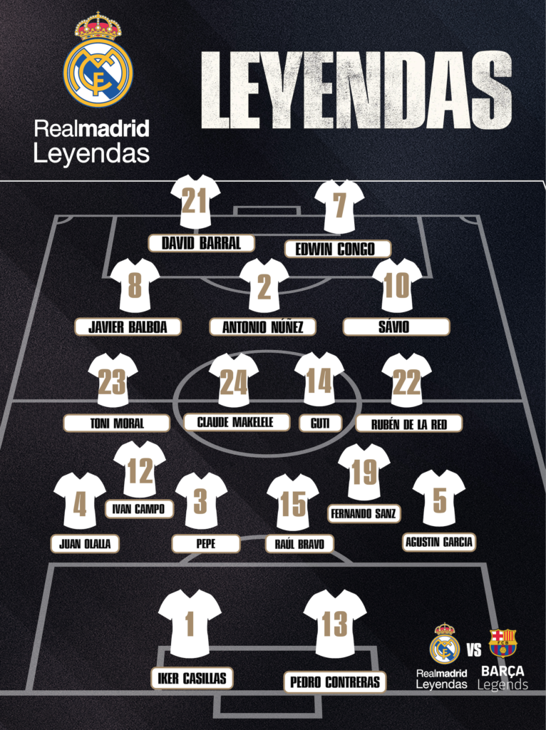Nómina del Real Madrid Leyendas: Pepe, Guti, Iker Casillas, Claude Makélélé, Sávio Bartolini, Fernando Sanz, David Barral, Raúl Bravo, Agustín García, Javier Balboa, Iván Campo, Pedro Contreras, Juan Olalla, Edwin Congo, Antonio Núñez, Toni Moral y Rubén de la Red. El DT es José Antonio Camacho.
